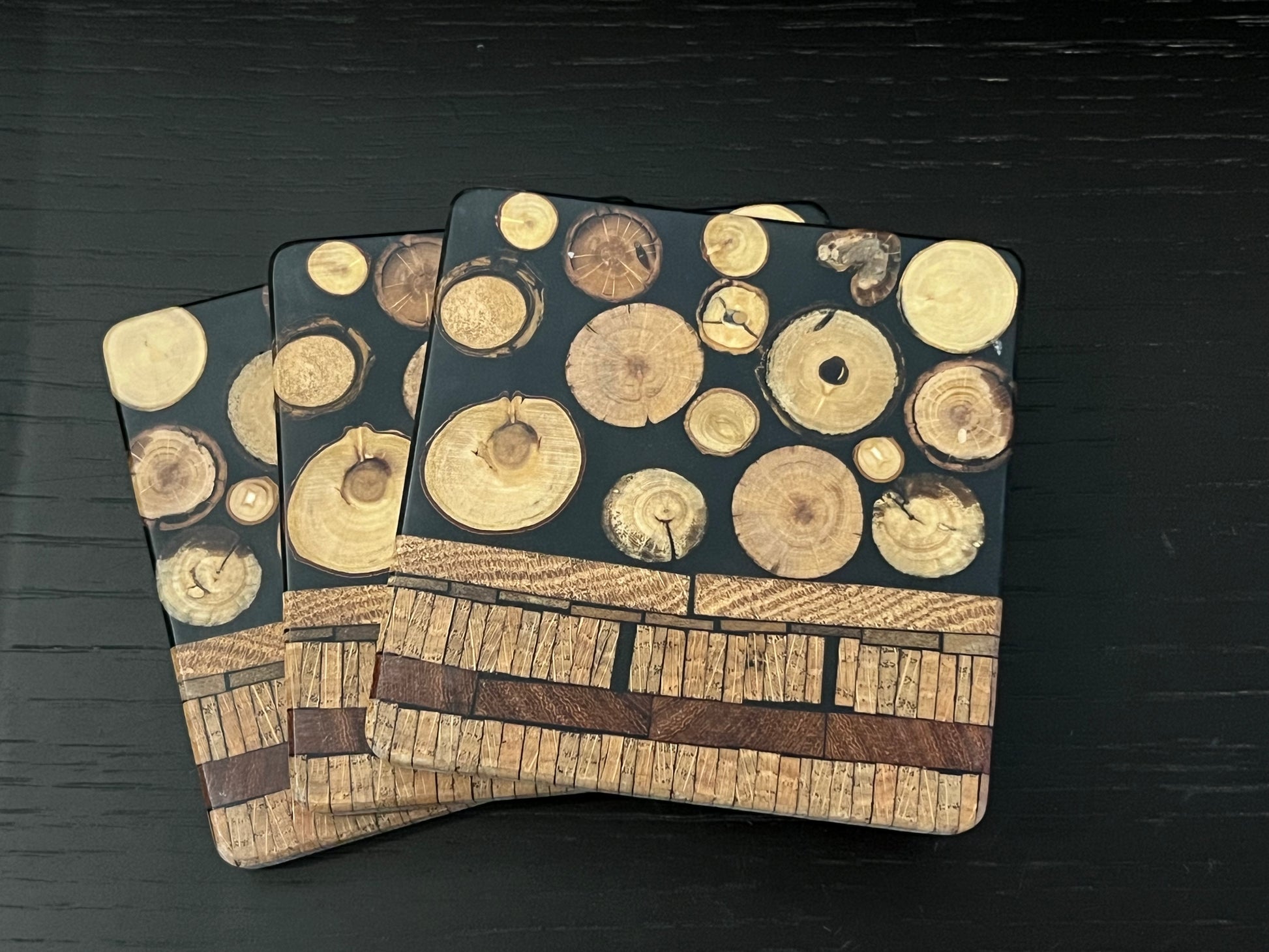 Epoxy coasters with slices of branches and logs from various species. Many collected from fallen trees and saved up to create the variety you see! Each batch is unique, as the species and sizes are never the same mix, just like nature. And sometimes we mix the style up adding elements of other of our styles.